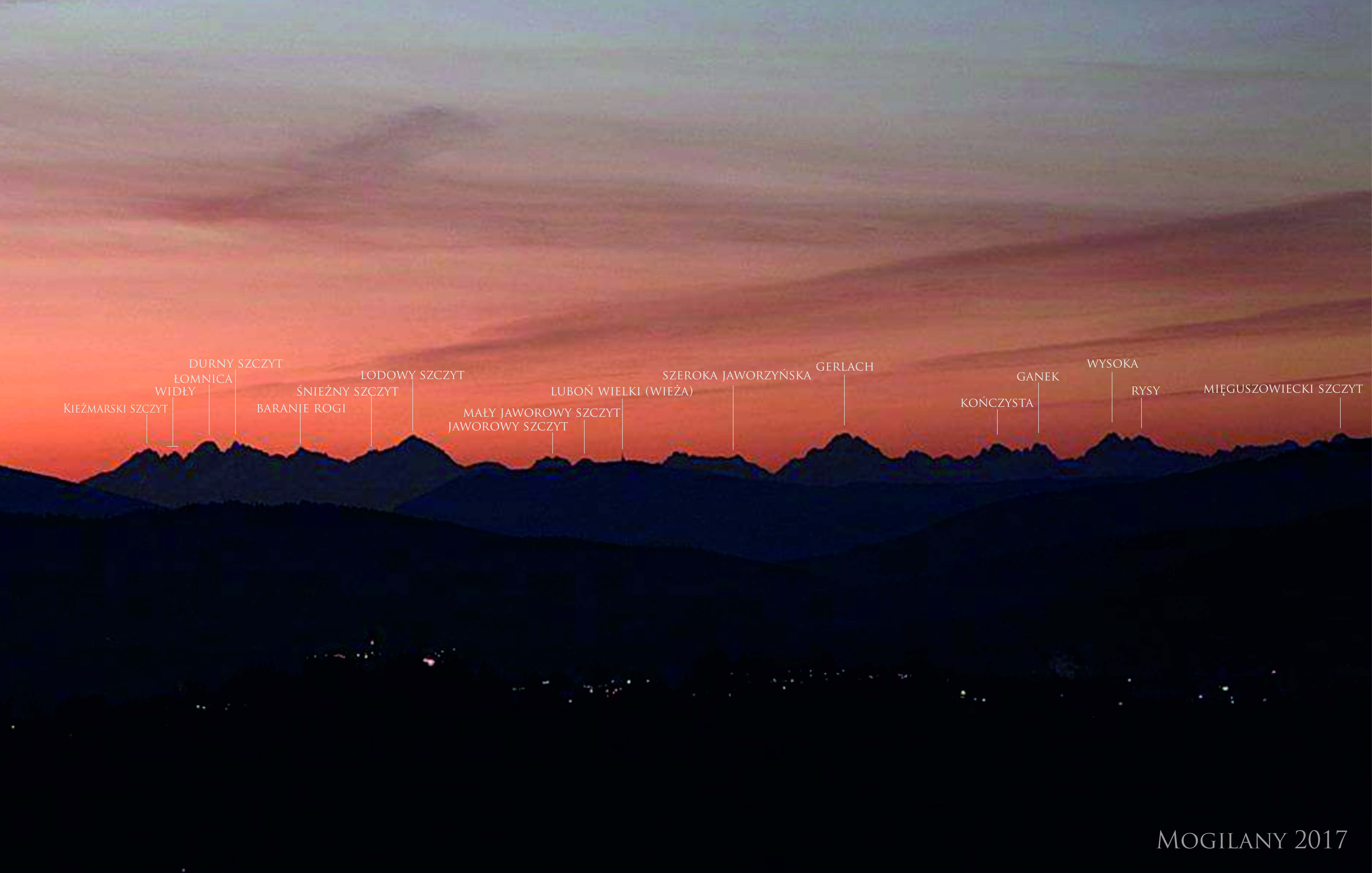 Mieszkaniec Gminy Mogilany przesłał nam wieczorne zdjęcie Tatr, na których naniósł nazwy szczytów. Dobrze wiedzieć na co się patrzy.